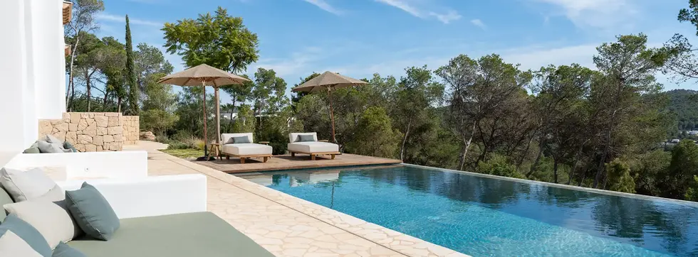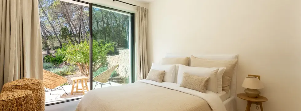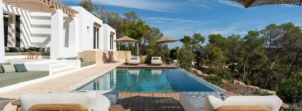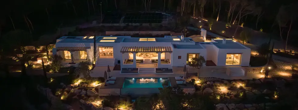 Ideal for those seeking a luxurious sanctuary, the villa features an open-plan layout with wide sliding doors that fill the interiors with natural light and create a seamless connection between indoor and outdoor living. The property includes five elegantly appointed bedrooms, five sophisticated bathrooms, and a 70 m² private pool surrounded by generous terraces—perfect for sunbathing, entertaining, and enjoying Ibiza’s idyllic climate. Surrounding the villa, meticulously landscaped Mediterranean gardens offer a peaceful retreat and enhance the sense of privacy and tranquility.
