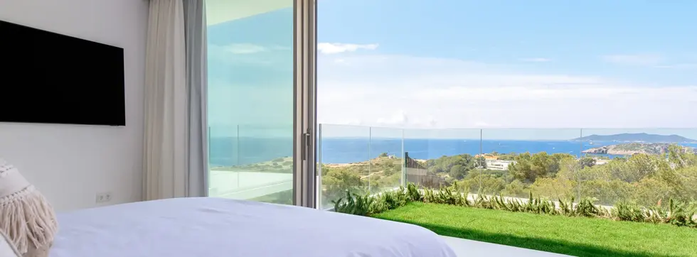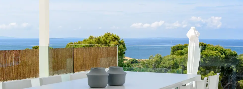 Set on a 2,757 m² plot with 430 m² of living space, the villa features six bedrooms and six bathrooms, distributed between the main house and a detached guest house. Designed in a rustic Ibicenco style, it marries authentic Balearic charm with modern finishes. Inside, the interiors include a welcoming living room, a contemporary kitchen, and an elegant dining area with fireplaces, creating ideal spaces for both relaxation and entertaining.