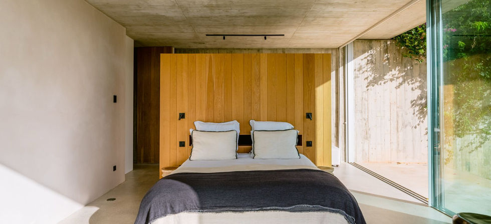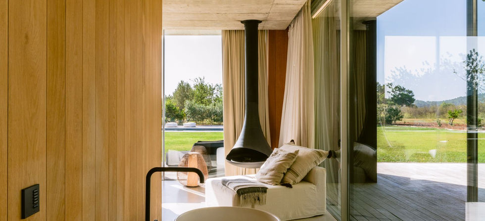Inside, generous open-plan living unfolds beneath floor-to-ceiling glass, where polished concrete floors and wide sliding panels invite the valley views to become part of daily life. The flow between kitchen, dining and lounge is effortless, while a fully equipped professional service kitchen sits discreetly behind the main kitchen, allowing a private chef to work seamlessly in the background. Sabina wood details and refined furnishings strike a poised balance between tradition and innovation. The principal suite is a statement in itself, with glass enclosure, warm wood panelling, smooth stone flooring, a suspended fireplace and a concealed freestanding bathtub, while four additional en-suite suites offer skylit walk-in showers and beautiful outlooks. Outdoors, days drift from plush poolside lounging to summer-kitchen lunches under leafy trees, with a gym, football pitch, ice bath, private cinema and a dedicated children’s playhouse completing this exceptionally liveable retreat curated by Ibiza Collection.