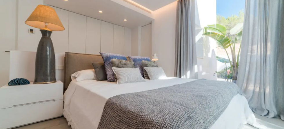 As the day fades into early evening, the terrace becomes the perfect refuge: an intimate shaded corner, built-in seating layered with richly colored cushions, cocktails shared among friends, and Ibiza’s southern light as a backdrop. Villa Manuela is designed for stylish gatherings, deep rest, and a calm, luxurious rhythm.