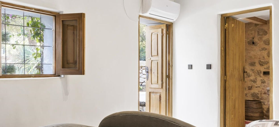 Inside, you’ll find traditional timber beams and natural stonework beautifully balanced with smooth concrete floors and custom-made furnishings. Comfort is prioritised throughout, with quality bedding, air-conditioning in all rooms, and thoughtfully designed modern bathrooms. Some rooms reflect the cosy proportions of the finca’s heritage, yet this only enhances the home’s warmth and authenticity.