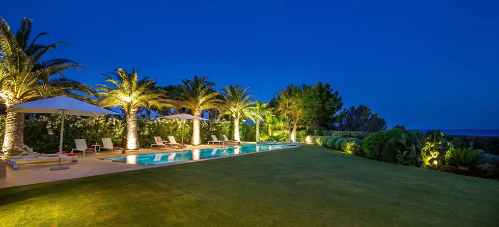 Designed for seamless Mediterranean living, the villa offers panoramic sea views from multiple terraces and generous open-air spaces. The 14 m × 4 m heated swimming pool operates with an active oxygen system and is surrounded by eight sun loungers, a sofa and three umbrellas—perfect for long, sun-soaked days overlooking the horizon.