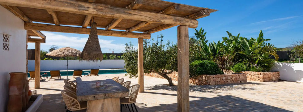 The main residence offers five generous en-suite bedrooms with elegant rain showers, including a master suite with a bathtub. A separate guest house (casita), set roughly 50 metres from the main villa, adds flexibility with an open-plan living/dining area, two bedrooms and a shared bathroom, ideal for hosting family and friends or accommodating guests independently. Outdoors, multiple terraces, a shaded dining area and a swimming pool exceeding 90 m² are framed by modern perimeter fencing and carefully designed lighting. A rare historic Ibizan tower within the garden adds a distinctive sense of heritage, making this Ibiza Collection property a uniquely complete Ibiza offering.